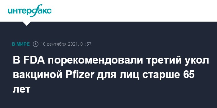 Москва. 18 сентября. INTERFAX.RU - Группа экспертов Управления по санитарному надзору за качеством пищевых продуктов и медикаментов США (FDA) порекомендовала третий укол вакциной Pfizer от COVID-19 для лиц 65 лет и старше, а также для тех, кто находится в группе высокого риска. Об этом сообщает Axios.