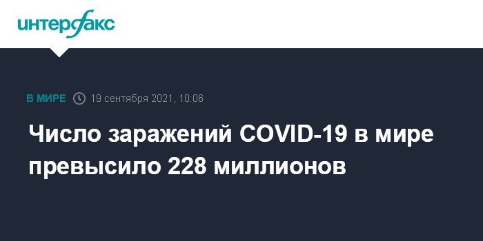 Москва. 19 сентября. INTERFAX.RU - Число диагностированных случаев заражений коронавирусом COVID-19 в мире на утро воскресенья составляет 228 млн 167 тыс. 999, говорится на сайте американского университета Джонса Хопкинса.