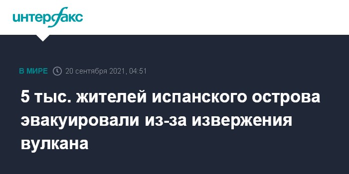 Москва. 20 сентября. INTERFAX.RU - Власти испанского острова Пальма, входящего в Канарский архипелаг в Атлантическом океане, были вынуждены эвакуировать 5 тыс. жителей из-за извержения вулкана Кумбре-Вьеха, сообщают СМИ со ссылками на официальные источники.