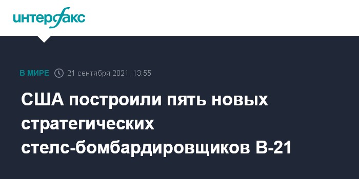 Москва. 21 сентября. INTERFAX.RU - ВВС США в скором времени получат пять новых стратегических бомбардировщиков B-21 Raider, построенных Northrop Grumman Corp., сообщил министр американских Военно-воздушных сил Фрэнк Кендалл.