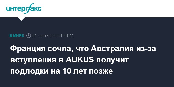 Москва. 21 сентября. INTERFAX.RU - Вступление Канберры в партнерство AUKUS и отказ от контракта с Парижем на строительство субмарин может привести к тому, что Австралия получит подводные лодки на десятилетие позже планировавшихся сроков - в 2040 году, заявил представитель Минобороны Франции Эрве Гранжан.