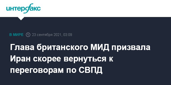 Москва. 23 сентября. INTERFAX.RU - Министр иностранных дел Великобритании Лиз Трасс провела встречу с главой МИД Ирана Амиром Абдоллахияном и призвала иранскую сторону к скорейшему возобновлению венских переговоров по Совместному всеобъемлющему плану действий (СВПД), сообщил представитель правительства Великобритании.