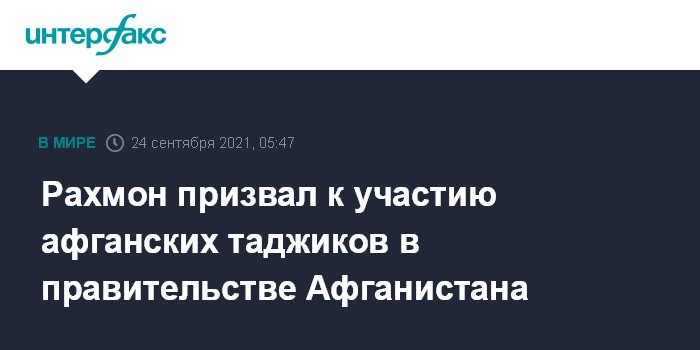 Москва. 24 сентября. INTERFAX.RU - Президент Таджикистана Эмомали Рахмон в своем видеообращении к участникам 76-й сессии Генеральной Ассамблеи ООН призвал к формированию инклюзивного правительства Афганистана, с участием, в том числе, афганских таджиков.