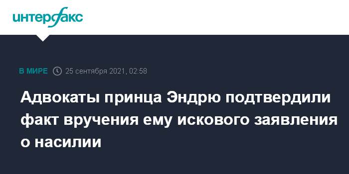 Москва. 25 сентября. INTERFAX.RU - Адвокаты британского принца Эндрю согласились с фактом вручения ему искового заявления американки Вирджинии Джуфре (в прошлом Робертс) с обвинением в сексуальном насилии. Об этом сообщает BBC News.