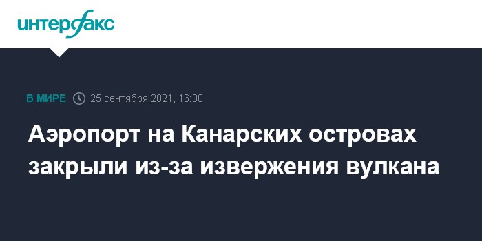 Москва. 25 сентября. INTERFAX.RU - Власти Испании закрыли в субботу аэропорт на острове Пальма Канарского архипелага из-за облаков густого дыма и пепла, скопившихся при извержении вулкана Кумбре-Вьеха, передали местные СМИ.