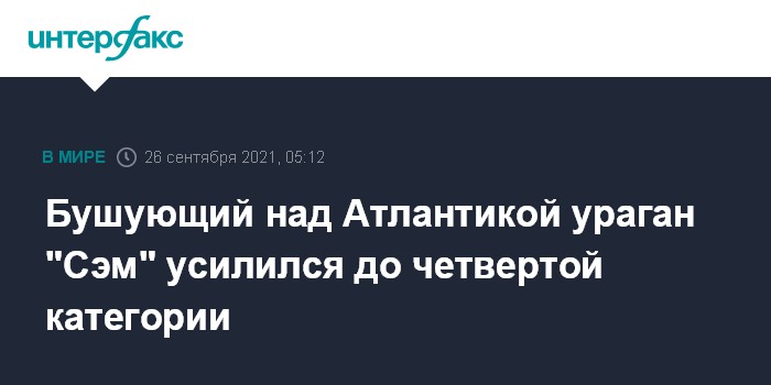 Москва. 26 сентября. INTERFAX.RU - Ураган "Сэм" усилился до четвертой из пяти возможных категорий и продолжает бушевать над Атлантическим океаном, сообщает The Washington Post со ссылкой на Национальный центр по наблюдению за ураганами США.