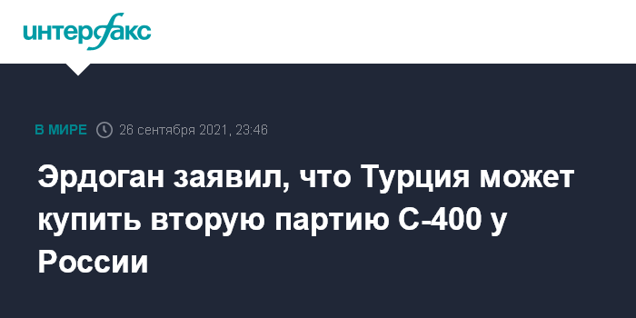 Москва. 26 сентября. INTERFAX.RU - Президент Турции Реджеп Тайип Эрдоган в воскресенье заявил о готовности купить у России вторую партию ЗРС С-400, несмотря на предупреждение о возможных последствиях со стороны США. Об этом сообщает Axios.