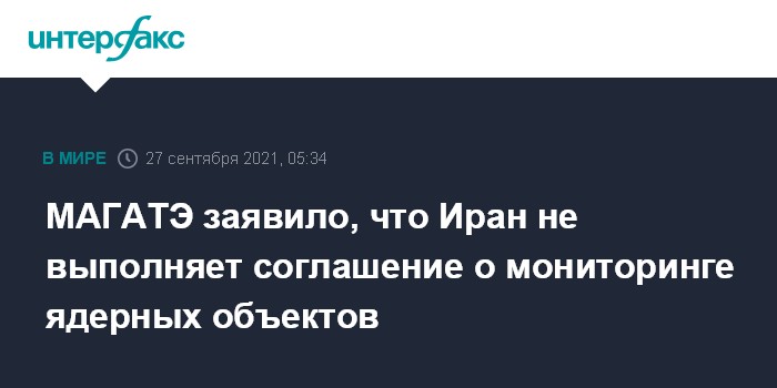 Москва. 27 сентября. INTERFAX.RU - Международное агентство по атомной энергии (МАГАТЭ) заявило о том, что Иран не выполняет условия соглашения о мониторинге ядерных объектов. Об этом сообщает The Hill.