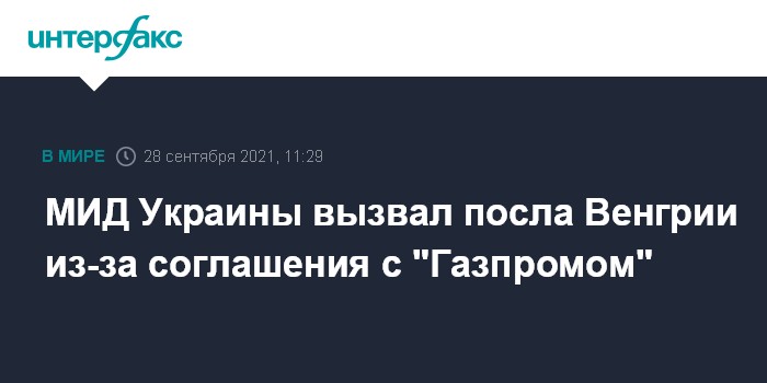 Москва. 28 сентября. INTERFAX.RU - МИД Украины вызывает посла Венгрии для объяснения позиции Киева по соглашению Будапешта с "Газпромом", сообщил представитель ведомства Олег Николенко.