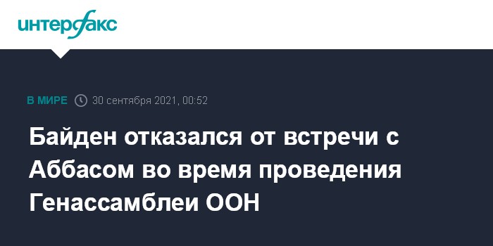 Москва. 30 сентября. INTERFAX.RU - Президент США Джо Байден отказался от встречи с президентом Палестины Махмудом Аббасом во время проведения Генассамблеи ООН. Об этом сообщает Axios со ссылкой на американские и палестинские источники.