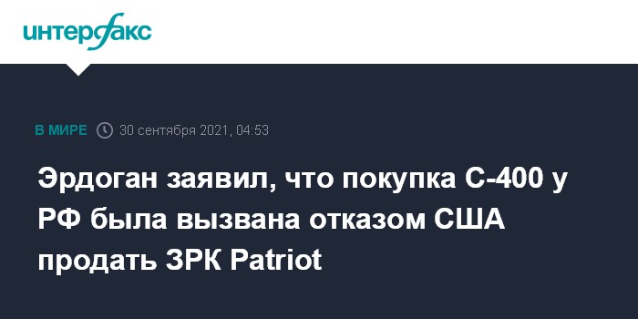 Москва. 30 сентября. INTERFAX.RU - Президент Турции Реджеп Тайип Эрдоган заявил, что приобретение у России систем противовоздушной С-400 было обусловлено отказом США поставить ей зенитные ракетные комплексы (ЗРК) Patriot.