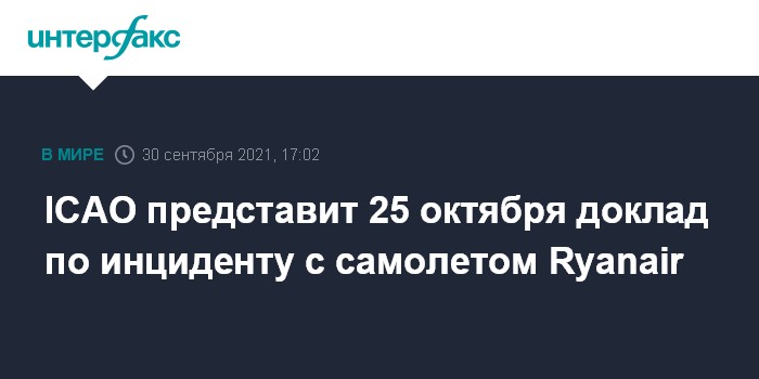Москва. 30 сентября. INTERFAX.RU - Международная организация гражданской авиации (ICAO) 25 октября в своей штаб-квартире в Монреале представит предварительный доклад об инциденте с самолетом Ryanair, который 23 мая по пути из Афин в Вильнюс вынужденно сел в Минске. Об этом сообщили в пресс-службе департамента авиации Минтранса Белоруссии.