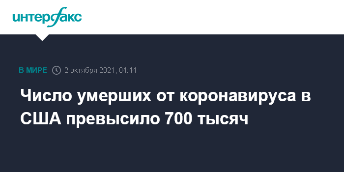 Москва. 2 октября. INTERFAX.RU - В США за время пандемии COVID-19 скончались более 700 тысяч человек, заразившихся коронавирусом, следует из данных американского Университета Джонса Хопкинса.