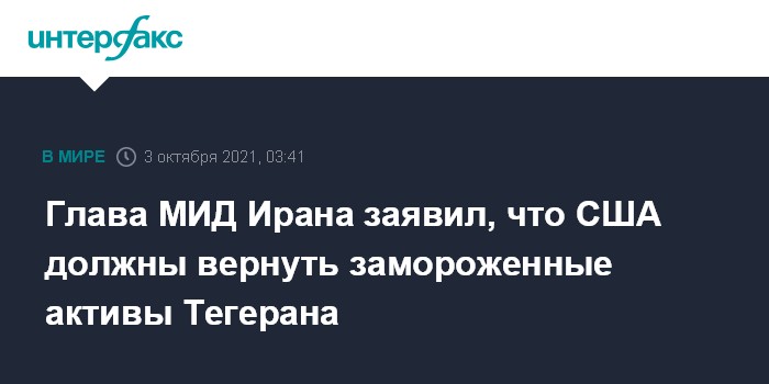 Москва. 3 октября. INTERFAX.RU - Министр иностранных дел Ирана Хоссейн Амир Абдоллахиян заявил, что Тегеран настаивает на том, чтобы Вашингтон в знак доброй воли и готовности к возобновлению переговоров в Вене по атому вернул $10 млрд замороженных средств Ирана.