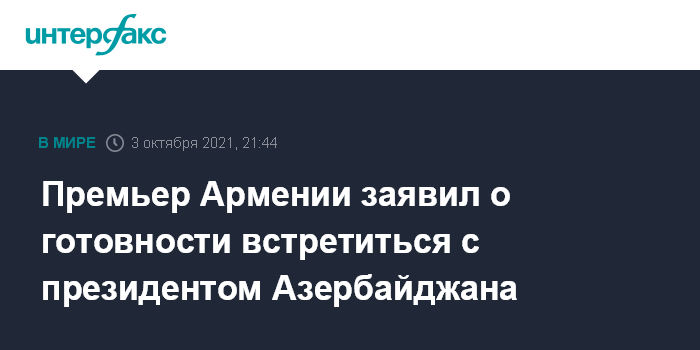 Москва. 3 октября. INTERFAX.RU - Премьер-министр Армении Никол Пашинян заявил о готовности встретиться с президентом Азербайджана Ильхамом Алиевым, обменять карты минных полей на содержащихся в Баку армянских пленных.