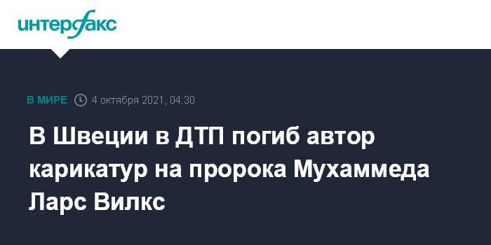 Москва. 4 октября. INTERFAX.RU - Шведский карикатурист, нарисовавший голову пророка Мухаммеда на теле собаки, погиб в дорожно-транспортном происшествии, сообщает BBC News со ссылкой на местные СМИ.