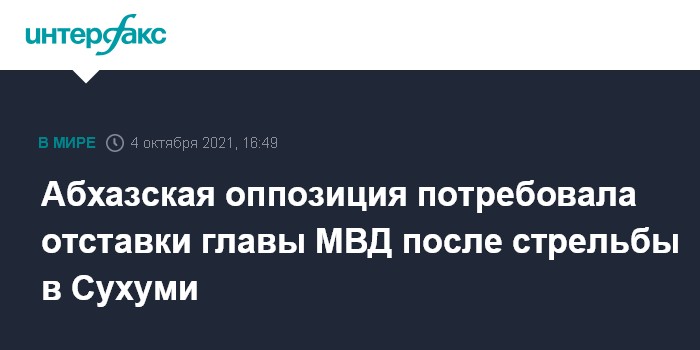 Москва. 4 октября. INTERFAX.RU - Представители абхазской оппозиции требуют немедленной отставки министра внутренних дел республики Дмитрия Дбара после стрельбы в Сухуми с участием депутата парламента Гарри Кокая, сотрудников полиции и группы ветеранов грузино-абхазской войны.