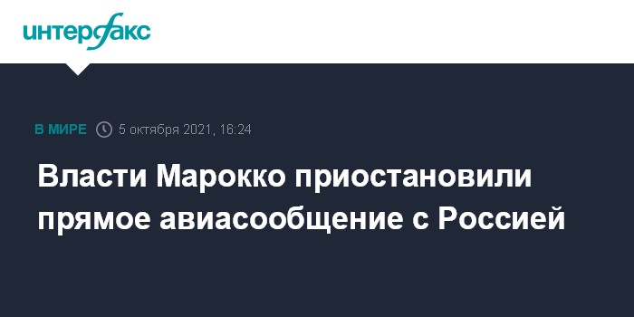 Москва. 5 октября. INTERFAX.RU - Власти Марокко с 5 октября временно остановили прямое авиасообщение с Россией, сообщает посольство РФ в Рабате.