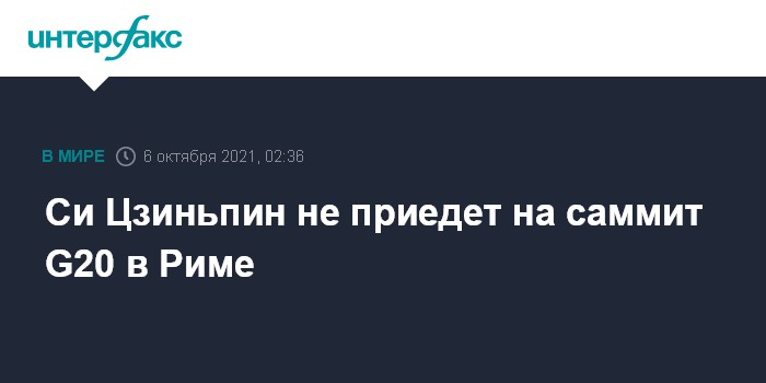 Москва. 6 октября. INTERFAX.RU - Председатель КНР Си Цзиньпин не будет лично участвовать в саммите G20 в Риме, сообщает агентство Bloomberg со ссылкой на осведомленные источники.
