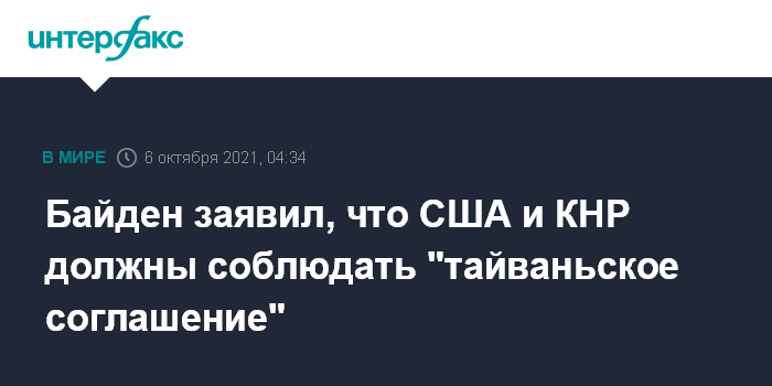 "Я говорил с Си Цзиньпином о Тайване. Мы согласны ... мы будем соблюдать тайваньское соглашение. Мы ясно дали понять, что я не думаю, что он (Пекин - ИФ) должен делать что-либо, кроме соблюдения соглашения", - сказал Байден журналистам в связи с обострившимися отношениями между материковым Китаем и островом.