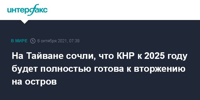 Москва. 6 октября. INTERFAX.RU - В настоящее время Пекин уже располагает возможностями для решения тайванского вопроса с помощью военной силы и будет полностью готов к этому к 2025 году, заявил глава оборонного ведомства Тайваня Цю Гочжэн.