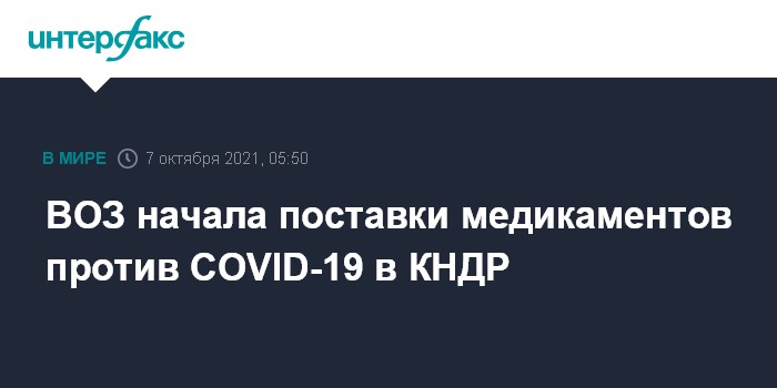 Москва. 7 октября. INTERFAX.RU - Всемирная организация здравоохранения (ВОЗ) заявила, что начала поставки медикаментов против COVID-19 в Северную Корею через китайский порт Далянь.