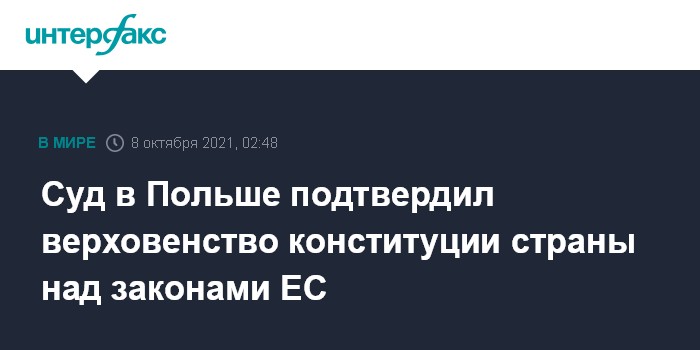 Москва. 8 октября. INTERFAX.RU - Конституционный трибунал Польши, задачей которого является проверка на соответствие конституции страны прочих нормативных актов, в четверг вынес решение, что ряд законов ЕС и некоторые судебные постановления ЕС противоречат основному закону Польши, сообщило агентство Associated Press.