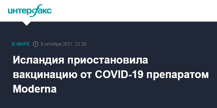 Москва. 8 октября. INTERFAX.RU - Власти Исландии вслед за некоторыми другими странами Европы приостановили применение вакцины от коронавируса COVID-19 компании Moderna из-за зафиксированных случаев побочных эффектов, сообщают западные СМИ со ссылкой на заявление Управления здравоохранения страны.