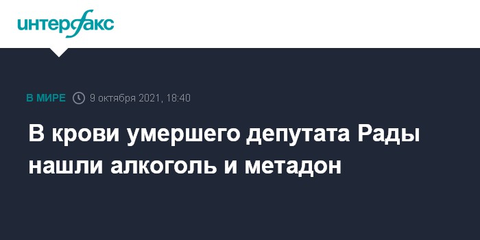 Москва. 9 октября. INTERFAX.RU - Токсикологи обнаружили в крови у скончавшегося накануне украинского депутата Антона Полякова (депутатская группа "За будущее") алкоголь и метадон. Об этом написала в своем телеграм-канале народный депутат Галина Янченко (фракция "Слуга народа").