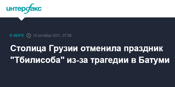 Москва. 10 октября. INTERFAX.RU - Назначенный в этом году на 24 октября праздник "Тбилисоба", посвященный сбору урожая и грузинской столице, отменен из-за трагедии в Батуми, где при обрушении подъезда жилого дома погибли и пострадали люди, заявил мэр Тбилиси Каха Каладзе.
