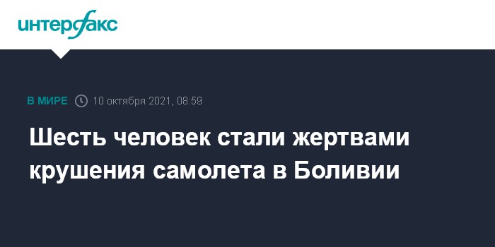 Москва. 10 октября. INTERFAX.RU - Шесть человек погибли при крушении самолета в департаменте Пандо в Боливии. Об этом заявил президент страны Луис Арсе в своем твиттере.