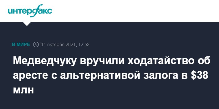 Москва. 11 октября. INTERFAX.RU - Ходатайство об аресте с альтернативой залога в 1 млрд грн (около $38 млн) вручено находящемуся под домашним арестом народному депутату фракции "Оппозиционная платформа - За жизнь" Виктору Медведчуку, сообщил его коллега по фракции Ренат Кузьмин.