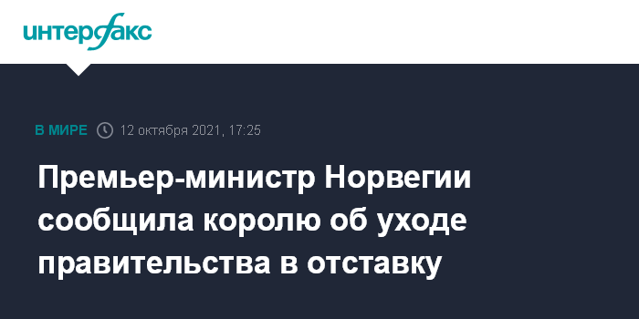 Москва. 12 октября. INTERFAX.RU - Премьер-министр Норвегии Эрна Сульберг проинформировала короля Харальда V об уходе ее правительства в отставку после поражения на парламентских выборах, сообщает во вторник издание Norway Today.