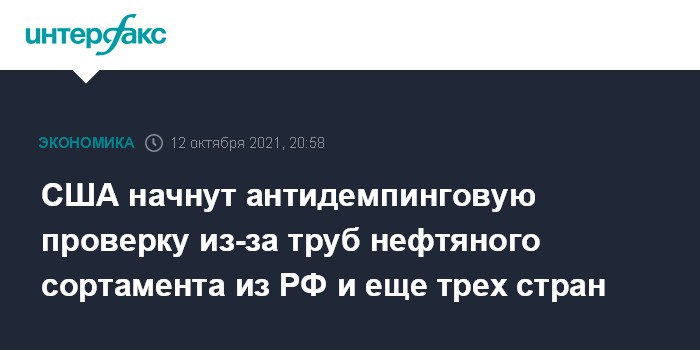 Москва. 12 октября. INTERFAX.RU - Международная торговая комиссия (ITC) США инициировала начало предварительного антидемпингового расследования в отношении ввозимых на территорию страны труб нефтяного сортамента (OCTG) из России, Аргентины, Мексики и Южной Кореи.