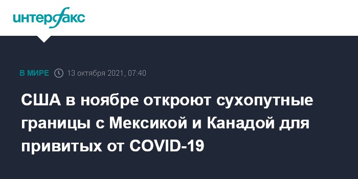 Москва. 13 октября. INTERFAX.RU - США готовятся вновь открыть сухопутные границы с Канадой и Мексикой для полностью вакцинированных лиц в начале ноября, сообщают американские СМИ.