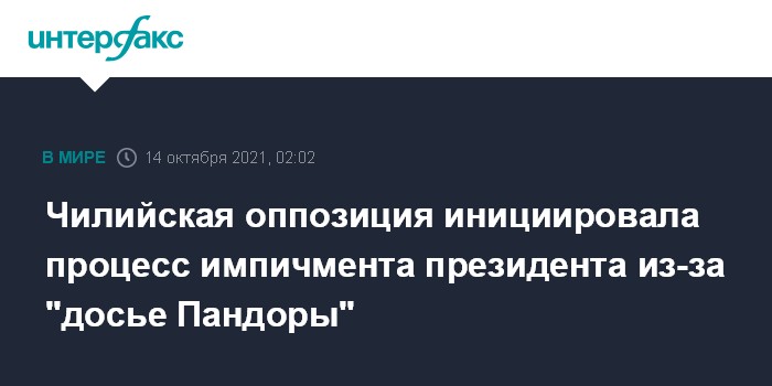 Москва. 14 октября. INTERFAX.RU - В Чили оппозиционные депутаты инициировали процесс импичмента президента страны Себастьяна Пиньеры после публикации "досье Пандоры", в котором содержалась информация о предполагаемых нарушениях при продаже горнодобывающей компании Доминга, сообщает Associsted Press.