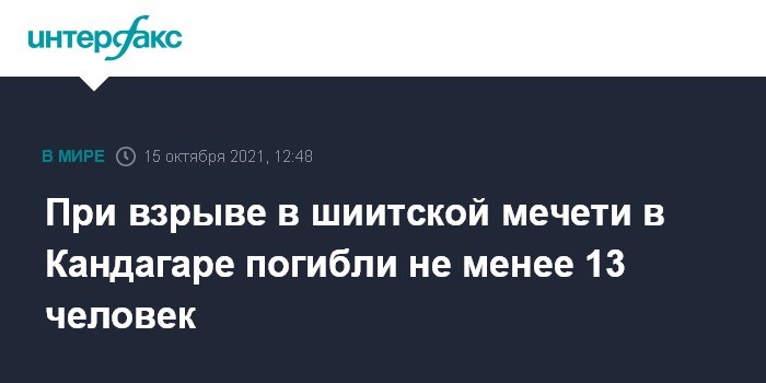 Москва. 15 октября. INTERFAX.RU - Не менее 13 человек погибли в результате взрыва, который произошел в пятницу в шиитской мечети в городе Кандагар на юге Афганистана, сообщают региональные СМИ.