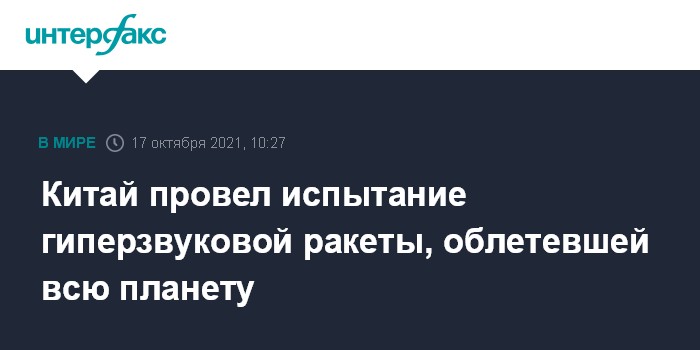 Москва. 17 октября. INTERFAX.RU - Китайская гиперзвуковая ракета, способная нести ядерный боезаряд, в августе облетела всю планету перед тем как поразить цель, сообщила газета Financial Times, ссылаясь на источники, ознакомленные с данными американской разведки.