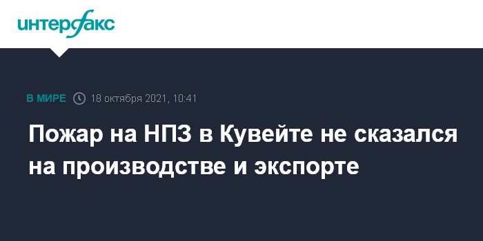 Москва. 18 октября. INTERFAX.RU - Пожар на нефтеперерабатывающем заводе Мина Аль-Ахмади в Кувейте не повлиял на производственные и экспортные операции, сообщает Кувейтская национальная нефтяная компания (KNPC) в Twitter.