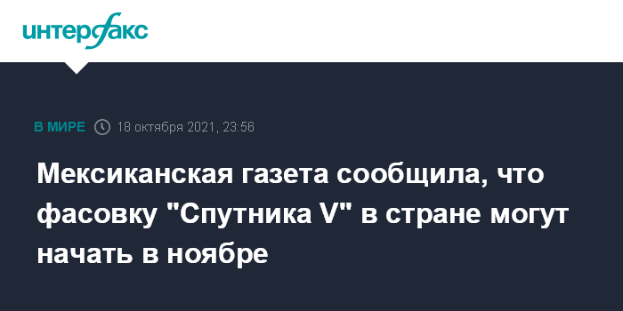 Москва. 18 октября. INTERFAX.RU - Мексика начнет фасовку российской вакцины "Спутник V" в течение второй половины ноября, сообщила в понедельник мексиканская газета "Финансьеро" со ссылкой на национальную лабораторию биоматериалов и реактивов (Birmex).