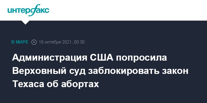Москва. 19 октября. INTERFAX.RU - Администрация президента США Джо Байдена обратилась в Верховный суд с просьбой заблокировать новый закон Техаса, запрещающий аборты, сообщает ABC News.