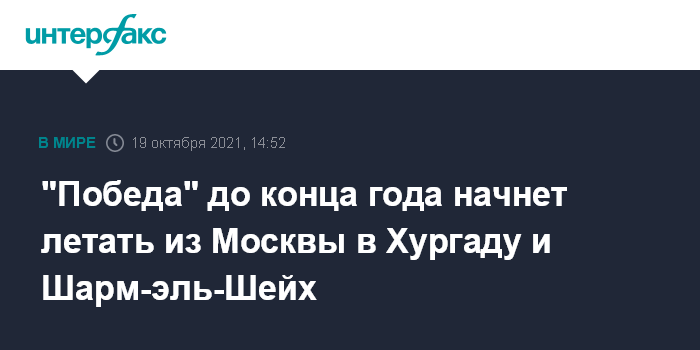 Москва. 19 октября. INTERFAX.RU - "Победа" (входит в группу "Аэрофлот") до конца 2021 года запустит рейсы из Москвы на курорты Египта – Хургаду и Шарм-эль-Шейх, сообщила журналистам представитель авиакомпании.
