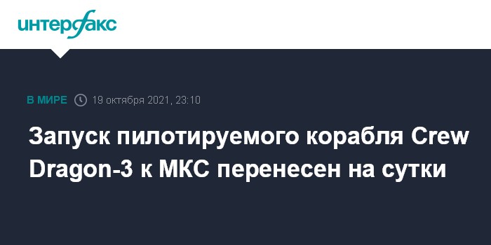 Москва. 19 октября. INTERFAX.RU - Запуск американского пилотируемого космического корабля Crew Dragon-3 компании SpaceX к Международной космической станции (МКС), который планировался 30 октября, перенесен на 31 октября, сообщило во вторник NASA.