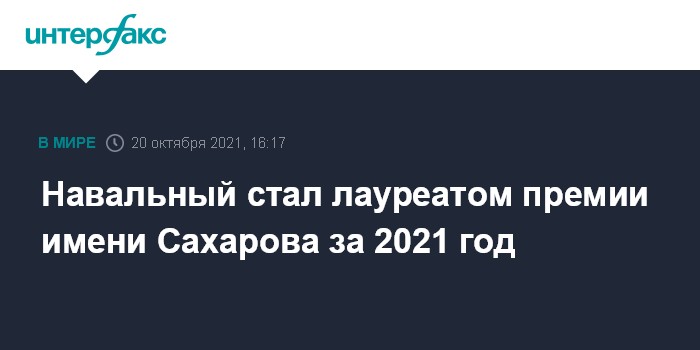 "Российский оппозиционер Алексей Навальный - лауреат премии Сахарова 2021 года", - говорится в сообщении, опубликованном в твиттере крупнейшей фракции Европарламента - Европейской народной партии.