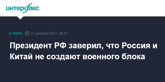 Москва. 21 октября. INTERFAX.RU - Россия и Китай не создают военного блока, опасения на этот счет беспочвенны, заявил президент РФ Владимир Путин.