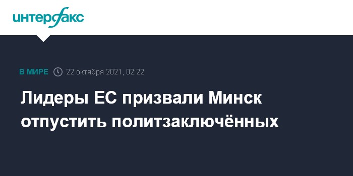 Москва. 22 октября. INTERFAX.RU - Главы государств и правительств ЕС по итогам первого дня саммита призвали власти Белоруссии вернуть свободу политическим оппонентам.