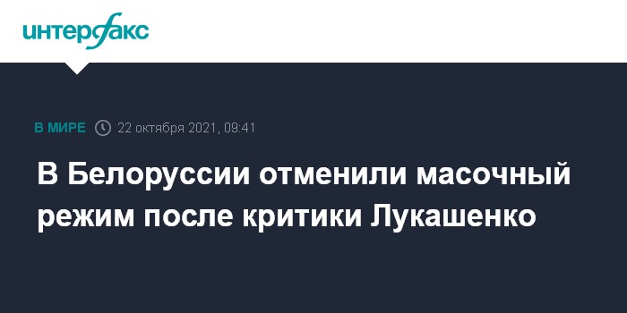 Москва. 22 октября. INTERFAX.RU - Министерство здравоохранения Белоруссии отменило обязательный масочный режим, введенный в республике 9 октября. Ранее эту меру раскритиковал президент страны Александр Лукашенко.