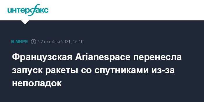 Москва. 22 октября. INTERFAX.RU - Французская аэрокосмическая компания Arianespace переносит запуск ракеты-носителя Ariane-5 с двумя спутниками из-за технических неполадок, сообщается в твиттере компании.
