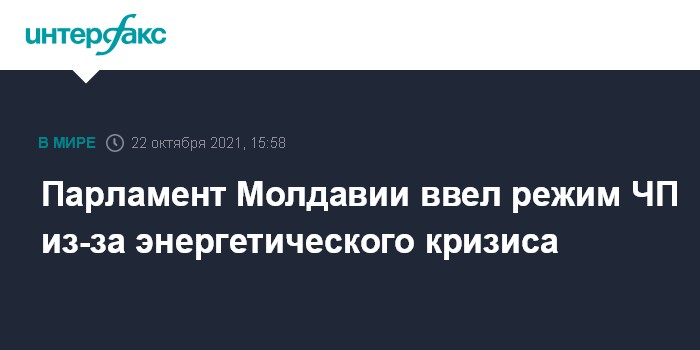 Москва. 22 октября. INTERFAX.RU - Парламент Молдавии проголосовал за введение в стране режима чрезвычайного положения на 30 дней, с 22 октября по 20 ноября, в связи с кризисом в энергетической сфере.