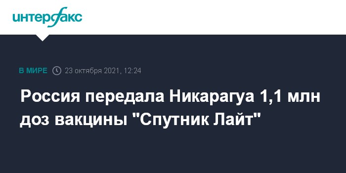 Москва. 23 октября. INTERFAX.RU - Россия доставила в Никарагуа 1,1 млн доз однокомпонентной вакцины от коронавируса "Спутник Лайт", сообщил в субботу Российский фонд прямых инвестиций (РФПИ).